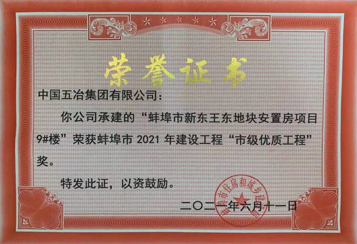 蚌埠市新東王東地塊安置房項目9#樓榮獲蚌埠市2021年建設(shè)工程“市級優(yōu)質(zhì)工程”獎