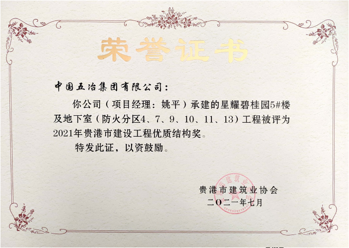 星耀碧桂園5#及地下室工程—2021年貴港市建設(shè)工程優(yōu)質(zhì)結(jié)構(gòu)獎