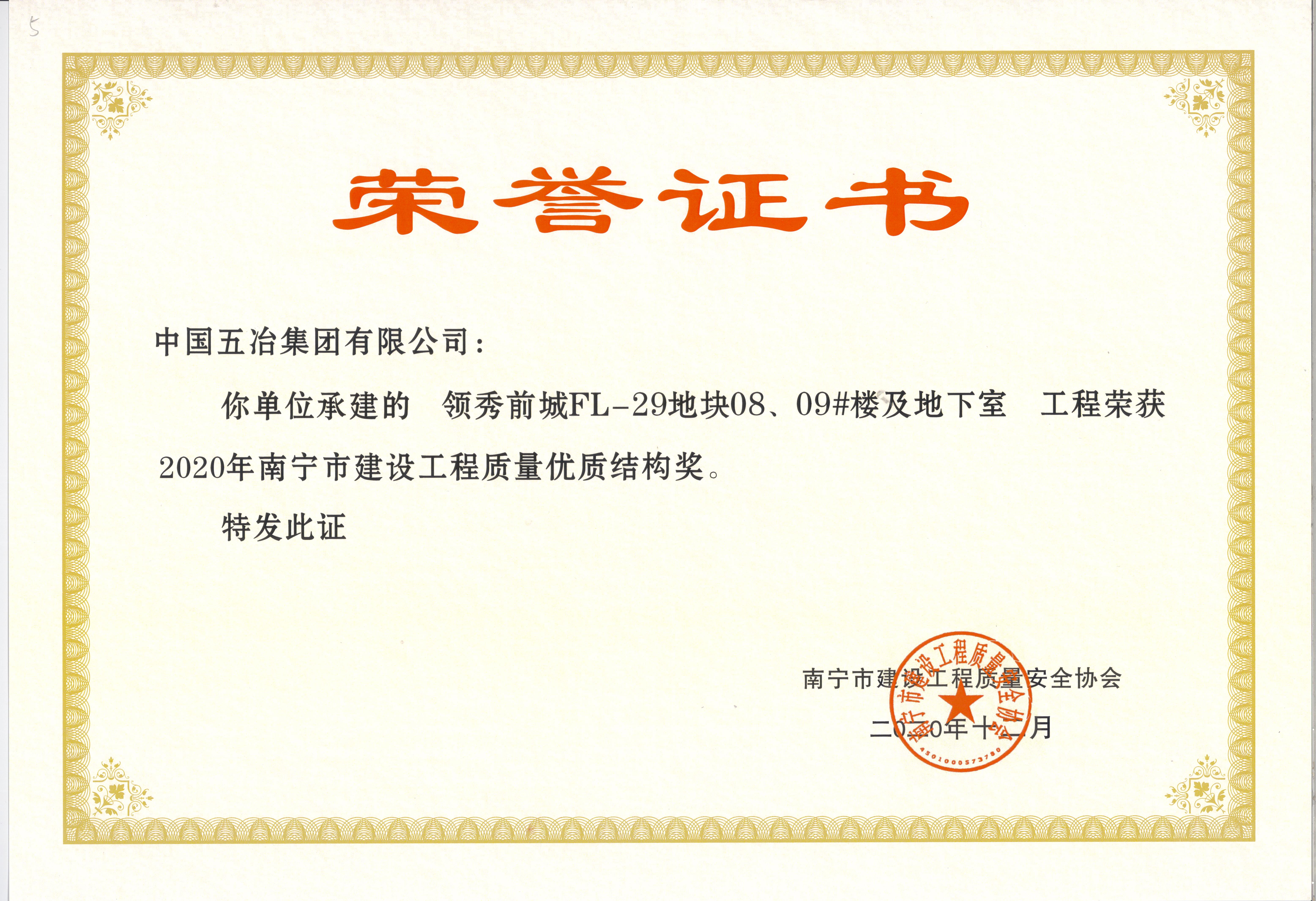 領(lǐng)秀前城FL-29地塊08、09#樓及地下室工程—2020年南寧市建設(shè)工程質(zhì)量優(yōu)質(zhì)結(jié)構(gòu)獎