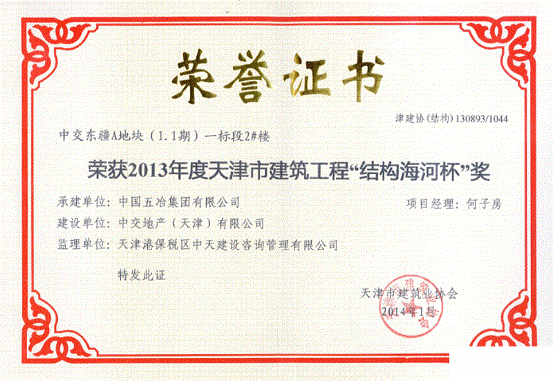 中交東疆A地塊(1. 1期)一標(biāo)段40#樓--2013年度天津市建筑工程“結(jié)構(gòu)海河懷"獎
