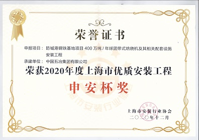 防城港鋼鐵基地項目400萬噸/年球團帶式焙燒機及其相關配套設施安裝工程-2020年度上海市優(yōu)質(zhì)安裝工程申安杯獎