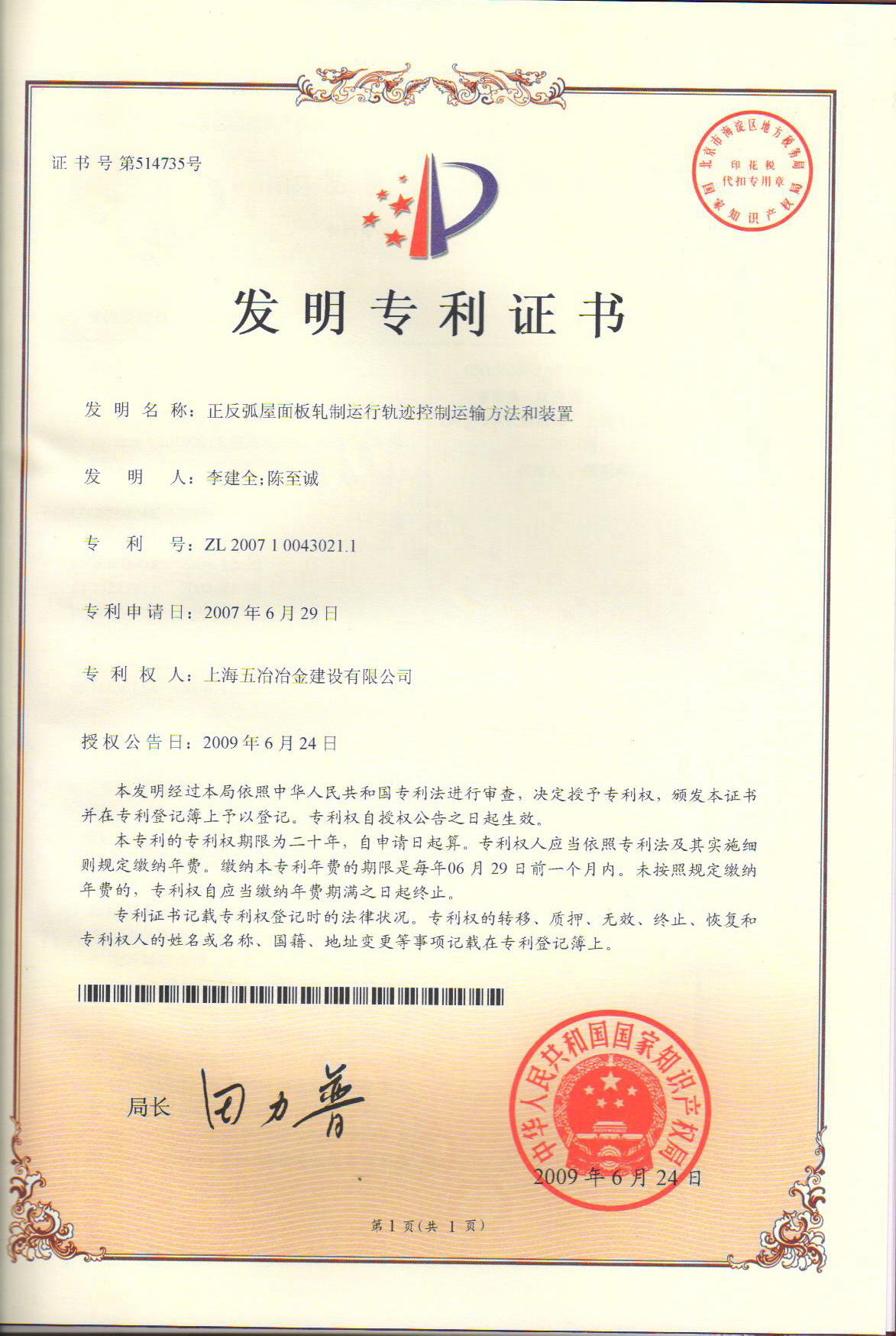 正反弧屋面板軋制運(yùn)行軌跡控制運(yùn)輸方法和裝置 ZL 200710043021.1