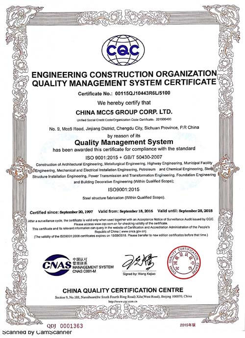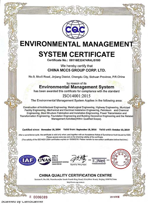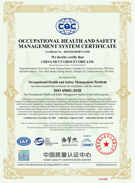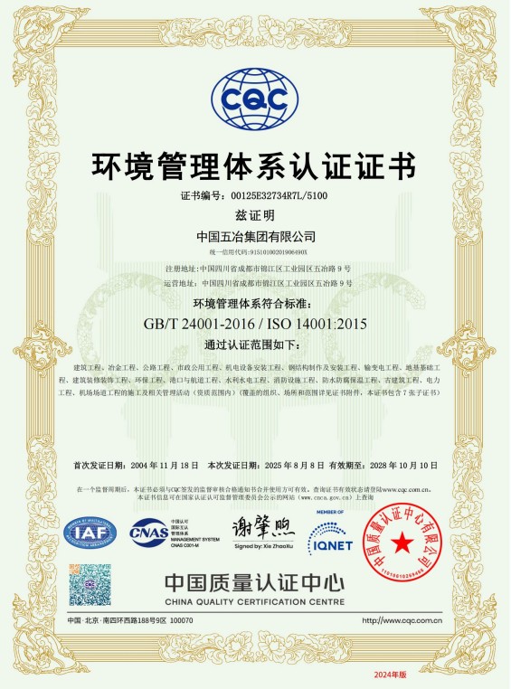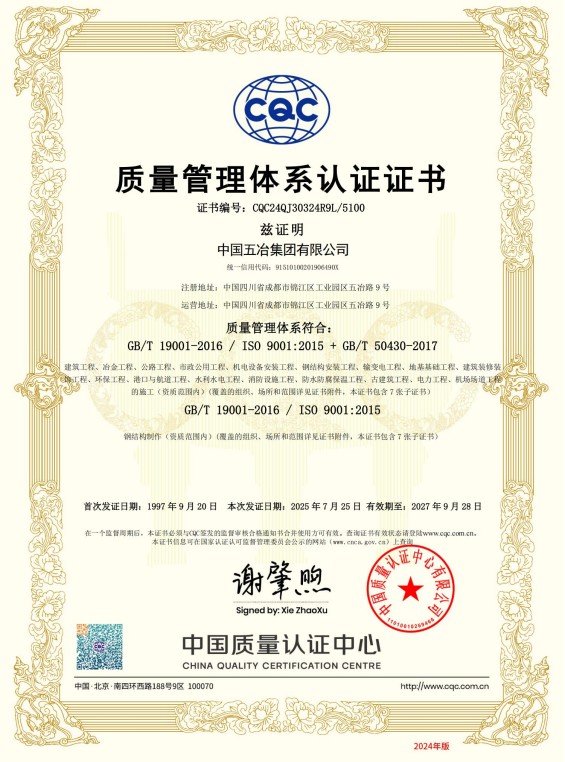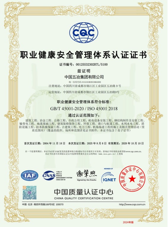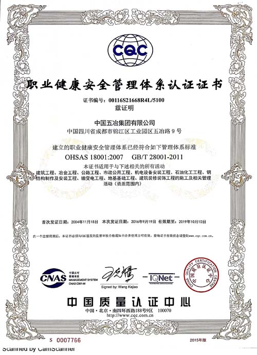 中國五冶集團(tuán)有限公司(以下簡(jiǎn)稱中國五冶集團(tuán)),1997年通過ISO9000質(zhì)量體系認(rèn)證。2004年,中國五冶集團(tuán)按照ISO9001、ISO14001、OHSAS18001國際標(biāo)準(zhǔn)要求,建立質(zhì)量環(huán)境職業(yè)健康安全整合型管理體系并通過三標(biāo)一體認(rèn)證。2011年,中國五冶集團(tuán)按照GB/T50430-2007《工程建設(shè)施工企業(yè)質(zhì)量管理規(guī)范》要求,建立并通過質(zhì)量環(huán)境職業(yè)健康質(zhì)量管理規(guī)范的三標(biāo)一規(guī)范體系認(rèn)證,至今保持三標(biāo)一規(guī)范管理體系連續(xù)、平穩(wěn)和協(xié)調(diào)運(yùn)行。
