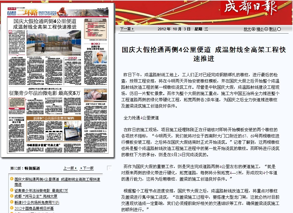 成都日報報道:國慶大假搶通兩側(cè)4公里便道 成溫射線全高架工程快速推進(jìn)