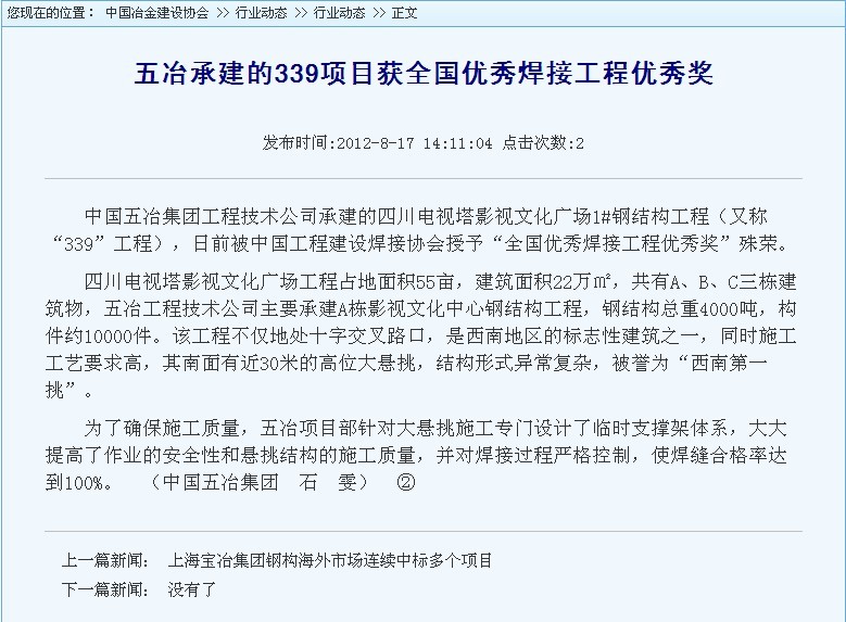 中國冶金建設(shè)協(xié)會網(wǎng)報道:五冶承建的339項目獲全國優(yōu)秀焊接工程優(yōu)秀獎