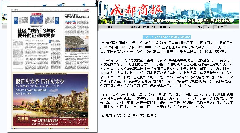 下一篇:成都晚報(bào)報(bào)道:明年5月底成溫射線(xiàn)高架通車(chē) 沒(méi)有紅綠燈