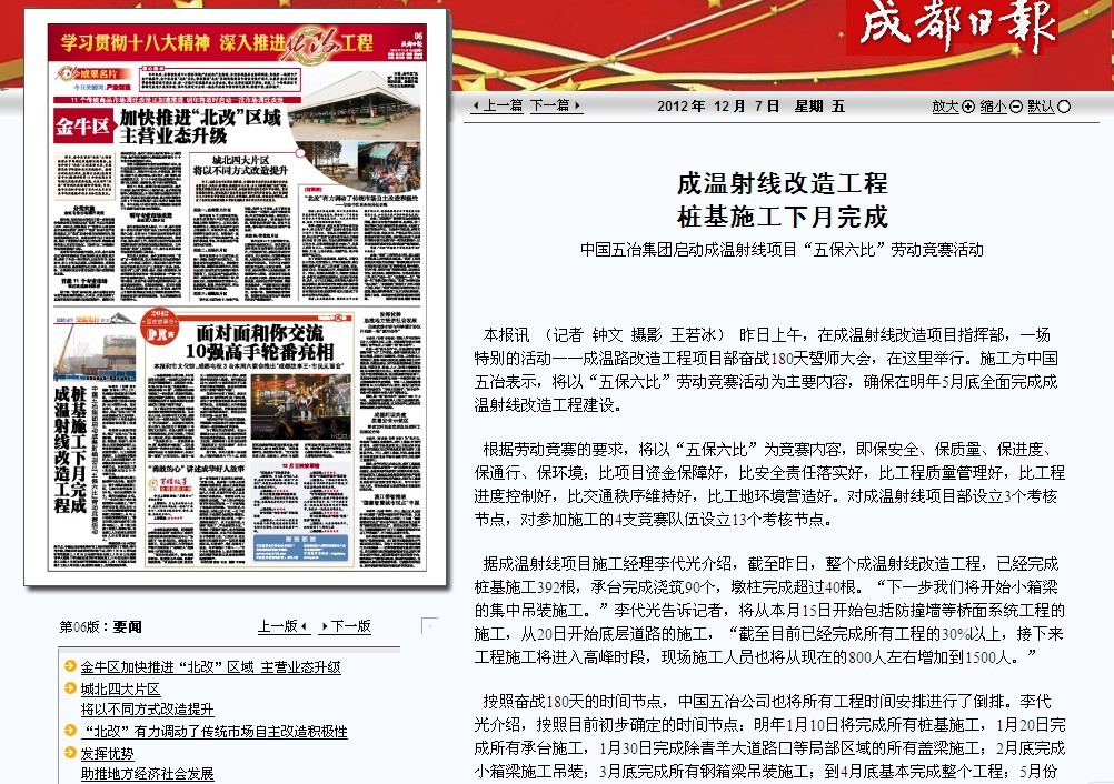 成都日報報道:成溫射線改造工程樁基施工下月完成