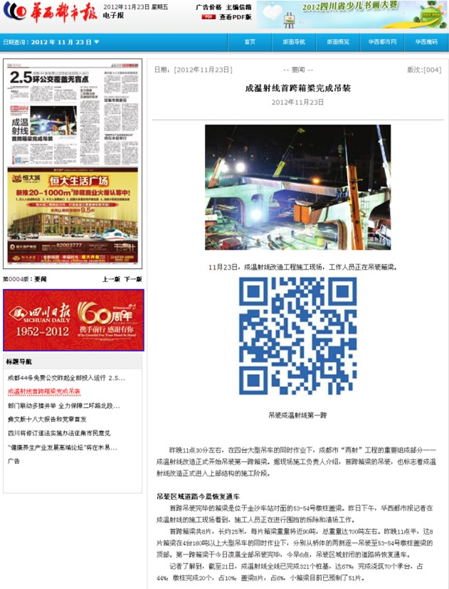 華西都市報(bào)報(bào)道:成溫射線(xiàn)首跨箱梁完成吊裝