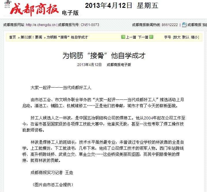 成都商報報道:為鋼筋“接骨”他自學(xué)成才