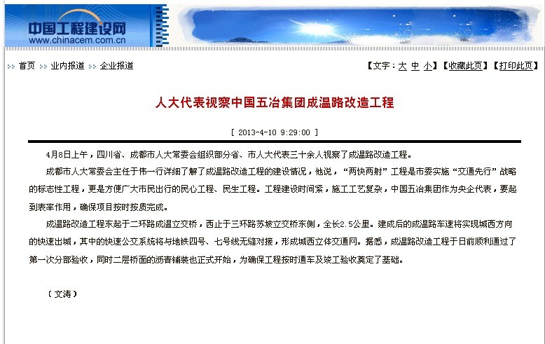 中國工程建設(shè)網(wǎng)報道:人大代表視察中國五冶集團成溫路改造工程