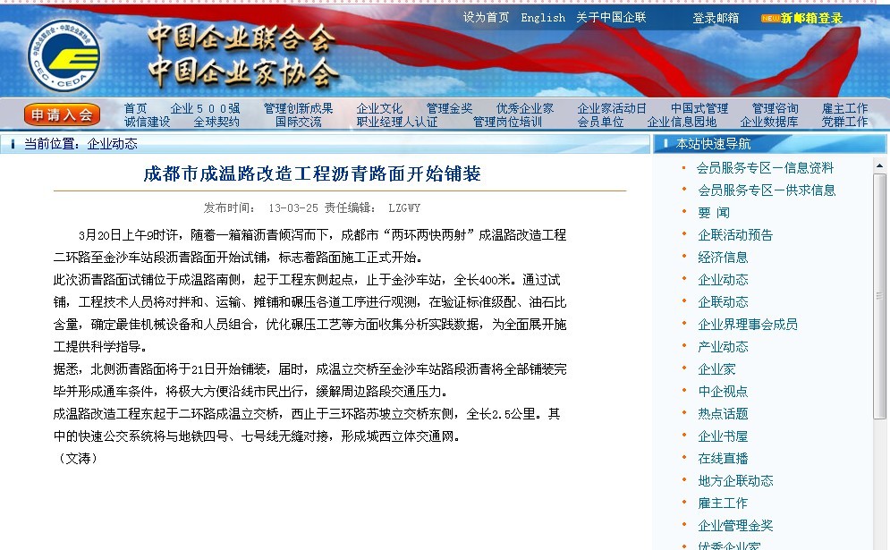 中國企業(yè)聯(lián)合會網報道:中國五冶集團成溫路改造工程瀝青路面開始鋪裝