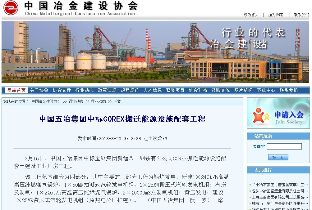 中國冶金建設(shè)協(xié)會網(wǎng)報道:中國五冶集團中標(biāo)COREX搬遷能源設(shè)施配套工程