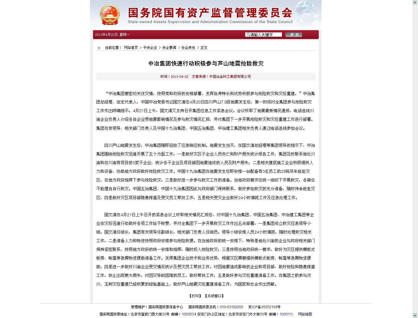 四川蘆山地震發(fā)生后,中冶集團(tuán)隨即啟動(dòng)了應(yīng)急響應(yīng)機(jī)制。地震發(fā)生當(dāng)天,在國(guó)文清總經(jīng)理等集團(tuán)領(lǐng)導(dǎo)的指示下,中冶集團(tuán)圍繞搶險(xiǎn)救災(zāi)迅速開展了五個(gè)方面工作:一是做好災(zāi)區(qū)子企業(yè)人員傷亡和財(cái)產(chǎn)損失統(tǒng)計(jì)報(bào)告工作,集團(tuán)及時(shí)聯(lián)系地處川渝和在川渝有項(xiàng)目的5家子企業(yè),統(tǒng)計(jì)各子企業(yè)及項(xiàng)目部因地震造成的人員及財(cái)產(chǎn)損失;二是相關(guān)建筑施工企業(yè)積極提供人力和設(shè)備,協(xié)助地方政府做好搶險(xiǎn)救災(zāi)工作。中國(guó)十九冶集團(tuán)在地震發(fā)生后即安排一臺(tái)配備有3名員工的25噸吊車趕赴災(zāi)區(qū),在地方政府指揮下參與搶險(xiǎn)救災(zāi);三是做好進(jìn)一步參與救災(zāi)工作的準(zhǔn)備。當(dāng)?shù)卣笤诮y(tǒng)一組織下開展救災(zāi),各單位不能擅自自行救災(zāi)。中國(guó)五冶集團(tuán)、中國(guó)十九冶集團(tuán)因此與政府部門保持聯(lián)系,做好參加救災(zāi)的充分準(zhǔn)備,隨時(shí)待命趕赴災(zāi)區(qū);四是做好災(zāi)區(qū)項(xiàng)目部隱患排查及受災(zāi)員工幫扶工作;五是相關(guān)受災(zāi)企業(yè)做好24小時(shí)值班工作及應(yīng)急處理工作。