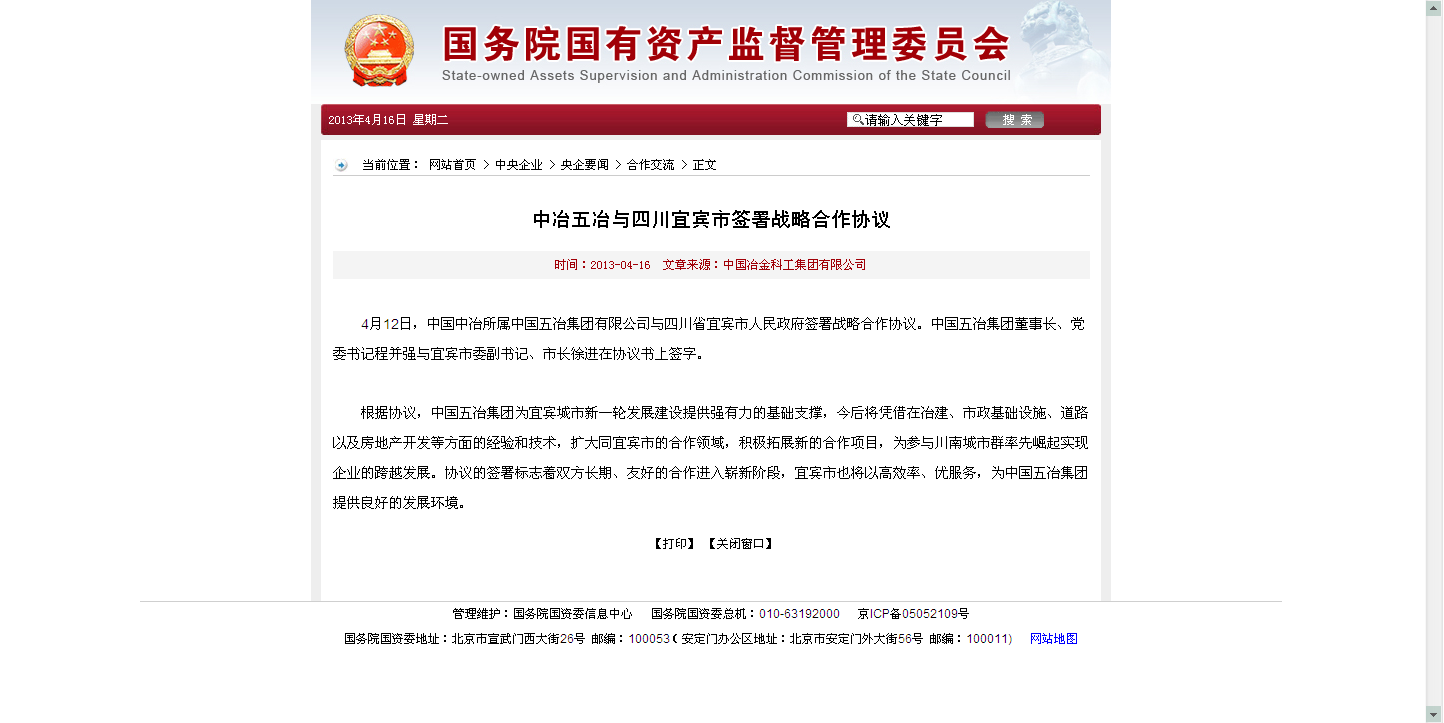 國資委報道:中冶五冶與四川宜賓市簽署戰(zhàn)略合作協(xié)議