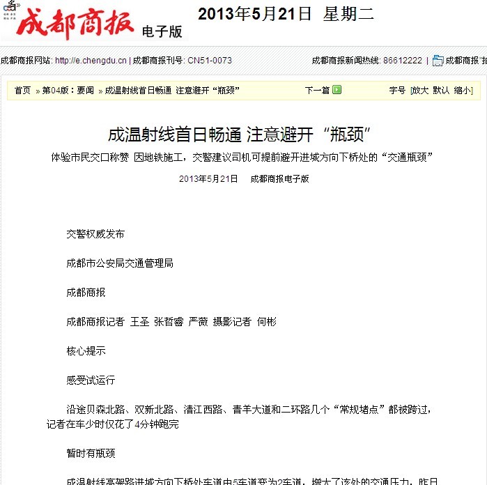昨日早晨8時,隨著兩端起點向車輛開放,全長3.6公里的成溫射線開始通車試運行。通車首日,從二環(huán)路立交至蘇坡立交一線的進出城通道大大提速,周邊道路的交通壓力有所緩解。