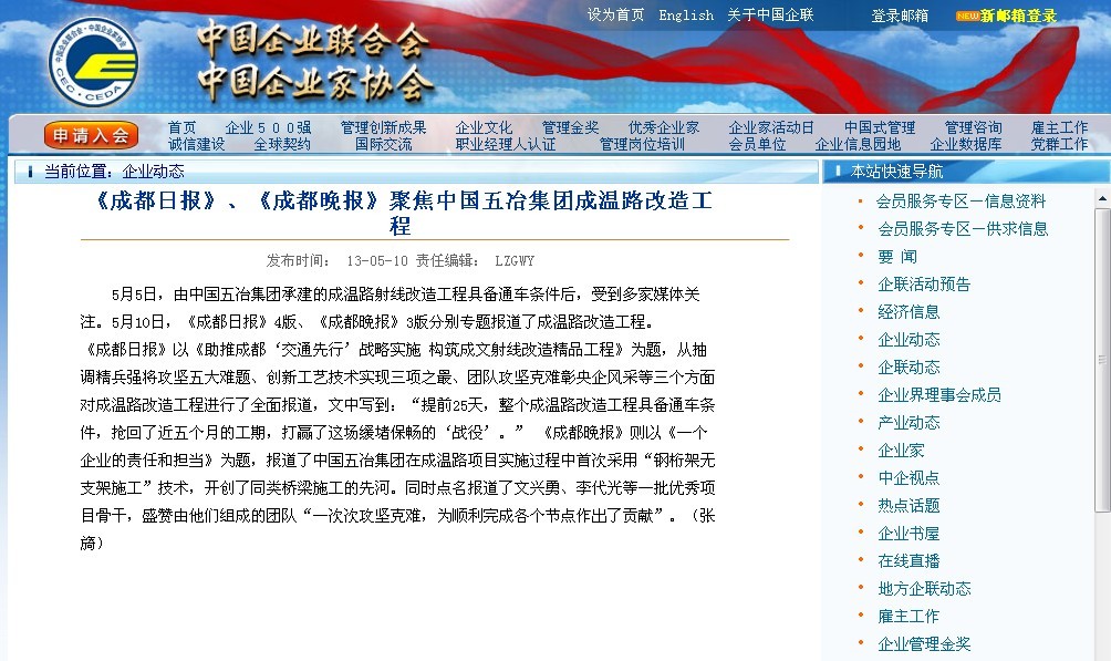 中國企業(yè)聯(lián)合會網(wǎng)報道:《成都日報》、《成都晚報》聚焦中國五冶集團成溫路改...