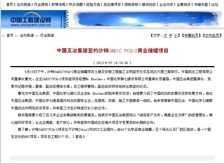 中國工程建設網(wǎng)報道:中國五冶集團簽約沙特SABIC PCQ-2商業(yè)儲罐項目