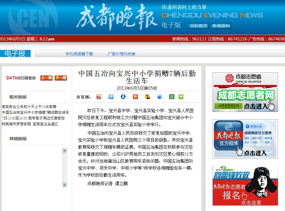 成都晚報報道:中國五冶向?qū)毰d中小學捐贈7輛后勤生活車