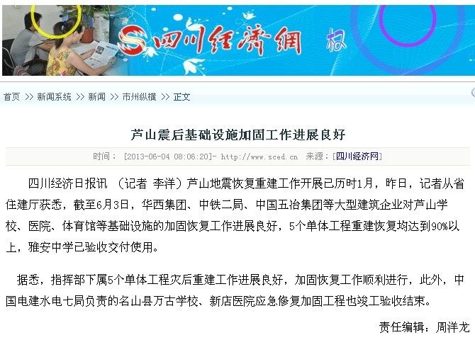四川經(jīng)濟日報報道:蘆山震后基礎(chǔ)設(shè)施加固工作進展良好