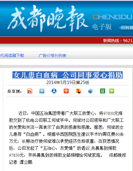 成都晚報報道:女兒患白血病 公司同事愛心捐助