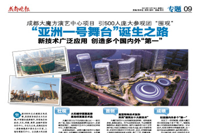 成都晚報(bào)對(duì)此進(jìn)行了全過(guò)程的跟蹤報(bào)道,并在12月18日發(fā)行的成都晚報(bào)中進(jìn)行了整版宣傳報(bào)道。報(bào)道指出:成都大魔方項(xiàng)目是一個(gè)擁有世界一流,國(guó)際領(lǐng)先水平的演藝兼容體育賽事的大型現(xiàn)代化場(chǎng)館項(xiàng)目;是一個(gè)擁有六大超級(jí)業(yè)態(tài)價(jià)值鏈有效疊加,相得益彰,素質(zhì)一流的大型城市綜合體項(xiàng)目;是一個(gè)占盡成都高端資源配套和絕版核心地段的文化產(chǎn)業(yè)商業(yè)地產(chǎn)項(xiàng)目。歷史賦予了它承擔(dān)現(xiàn)代文明城市精神圖騰和文化地標(biāo)的使命!在成都大魔方項(xiàng)目實(shí)施中,中國(guó)五冶創(chuàng)造了多個(gè)國(guó)內(nèi)外“第一”,在成都的工程建設(shè)中,寫(xiě)下了濃墨重彩的一筆,這也贏得成都建設(shè)部門及行業(yè)的一致稱道。(譚波瀾)