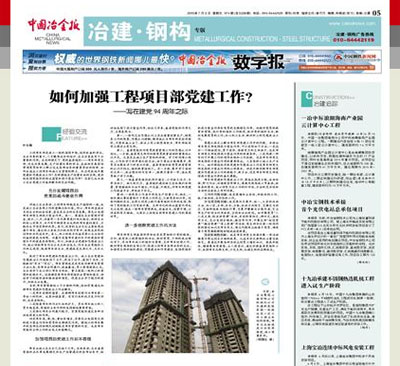 7月3日,中國冶金報第5版(冶建?鋼構(gòu)專版)報道:由五冶集團(tuán)上海有限機(jī)械化公司承建的云南昆明昆鐵家園一標(biāo)段住宅小區(qū)工程A棟主體結(jié)構(gòu)封頂,比業(yè)主要求工期提前將近1個月時間。項(xiàng)目部狠抓管理,確保施工的進(jìn)度、安全、質(zhì)量。標(biāo)志著機(jī)械化公司的市政、交通、民建產(chǎn)品的經(jīng)營能力有新的提升。