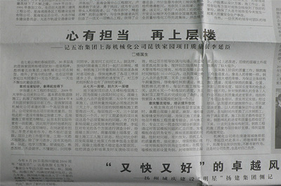 11月16日,《建筑時(shí)報(bào)》第3版,發(fā)表人物通訊《心有擔(dān)當(dāng),再上層樓》,報(bào)道中國五冶集團(tuán)上海有限機(jī)械化公司優(yōu)秀員工李延臣的先進(jìn)事跡。