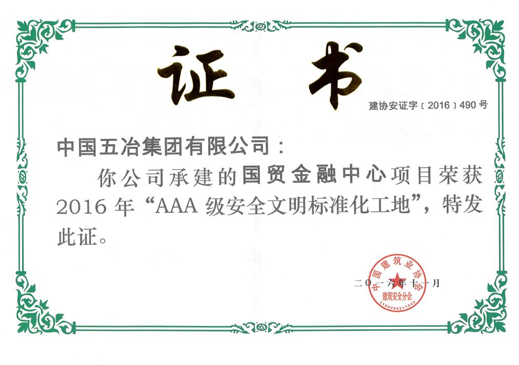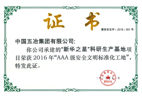 ? ?2016年12月,中國五冶集團(tuán)新華之星”科研生產(chǎn)基地工程項(xiàng)目和國貿(mào)金融中心工程項(xiàng)目榮獲2016年全國“AAA級(jí)安全文明標(biāo)準(zhǔn)化工地”稱號(hào)。