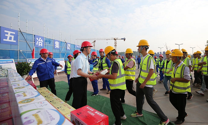 10月1日國(guó)慶節(jié),中國(guó)五冶集團(tuán)黨委書記、董事長(zhǎng)朱永繁一行到項(xiàng)目慰問(wèn)并帶班檢查。集團(tuán)公司領(lǐng)導(dǎo)周悅靜、萬(wàn)明海、譚興山、楊林源、張剛,相關(guān)非班子高管、副三總師、安全總監(jiān),生產(chǎn)經(jīng)營(yíng)部門及黨群工作部、辦公室負(fù)責(zé)人,四川地區(qū)各單位總經(jīng)理,分管履約、經(jīng)營(yíng)副總經(jīng)理,簡(jiǎn)陽(yáng)片區(qū)項(xiàng)目經(jīng)理等參加活動(dòng)。