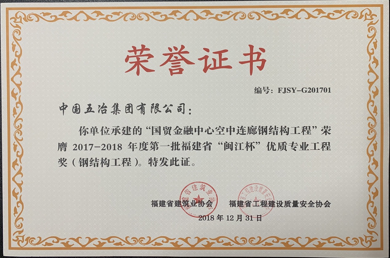 “國(guó)貿(mào)金融中心空中連廊鋼結(jié)構(gòu)工程”榮獲2017—2018年度第一批福建省“閩江杯”優(yōu)質(zhì)專業(yè)工程獎(jiǎng)(鋼結(jié)構(gòu)工程)