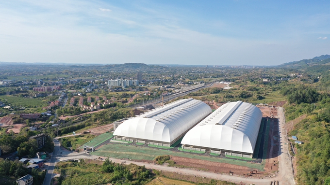 中國(guó)五冶集團(tuán)四川高興煤炭?jī)?chǔ)備基地項(xiàng)目負(fù)責(zé)人文元介紹,目前兩座長(zhǎng)度達(dá)308米、跨度達(dá)106米、高度達(dá)41米的大型鋼結(jié)構(gòu)煤棚已完成前期建設(shè),煤棚PVDF覆膜面積高達(dá)12萬(wàn)平米,相當(dāng)于16個(gè)標(biāo)準(zhǔn)足球場(chǎng)的大小。在膜結(jié)構(gòu)施工過(guò)程中,中國(guó)五冶項(xiàng)目團(tuán)隊(duì)克服了拱形結(jié)構(gòu)跨高比大、張拉精度高、施工難度大等問(wèn)題,為高興煤炭?jī)?chǔ)備基地穿上“外衣”。