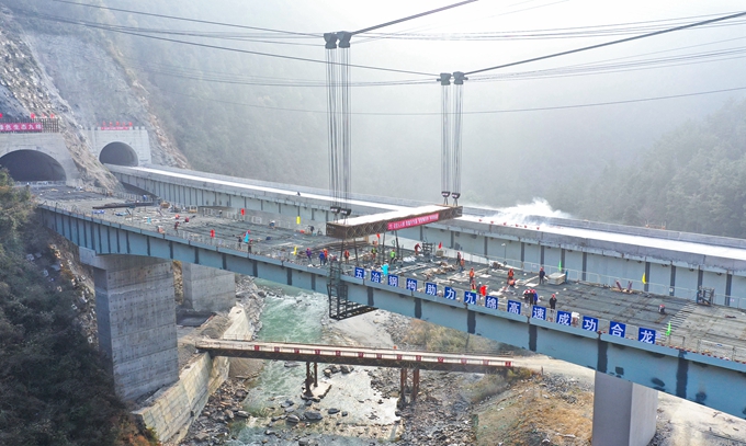 項(xiàng)目鋼結(jié)構(gòu)技術(shù)負(fù)責(zé)人黃治銘介紹,項(xiàng)目所處高山峽谷地帶地勢(shì)陡峭,無(wú)法提供大型起吊設(shè)備進(jìn)入施工現(xiàn)場(chǎng)的通道,加之大橋下方的平通河河道狹窄,傳統(tǒng)的機(jī)械吊裝和船只運(yùn)輸將對(duì)河流生態(tài)帶來(lái)破壞。“最終,考慮到大橋特殊的地理環(huán)境,施工團(tuán)隊(duì)研發(fā)了國(guó)內(nèi)首創(chuàng)的纜索吊裝懸拼安裝工藝,將大橋分成共計(jì)94節(jié)不同節(jié)段,采用單組60噸、雙組85噸的纜索吊解決垂直與水平運(yùn)輸難題,并借助混凝土梁掛籃施工的思路,運(yùn)用懸挑法對(duì)稱拼裝,實(shí)現(xiàn)20萬(wàn)套螺栓的100%穿孔,成功完成大橋共計(jì)5525噸鋼結(jié)構(gòu)的安裝任務(wù)?!?/p>