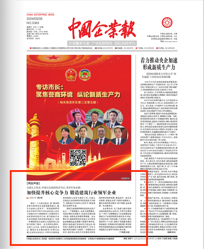 2024年全國兩會期間,全國人大代表,中國五冶集團(tuán)黨委書記、董事長朱永繁接受多家權(quán)威主流媒體專訪,積極履職建言獻(xiàn)策,實(shí)事求是講述五冶高質(zhì)量發(fā)展情況。3月8日,《中國企業(yè)報(bào)》頭版以《加快提升核心競爭力 鍛造建筑行業(yè)領(lǐng)軍企業(yè)》為題刊發(fā)對朱永繁代表的專訪報(bào)道,現(xiàn)對報(bào)道進(jìn)行全文轉(zhuǎn)發(fā)。