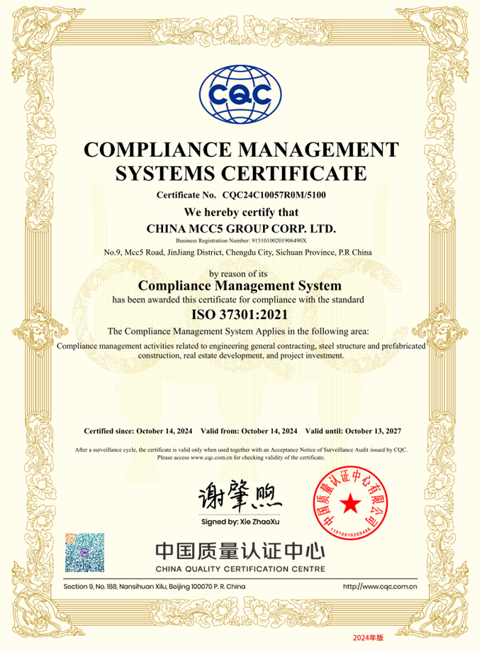 近日,中國五冶集團獲得由中國質量認證中心頒發(fā)的GB/T 35770-2022/ISO 37301:2021合規(guī)管理體系認證證書,標志著公司合規(guī)管理水平全面達到國內、國際標準要求,合規(guī)管理體系建設邁上新臺階。