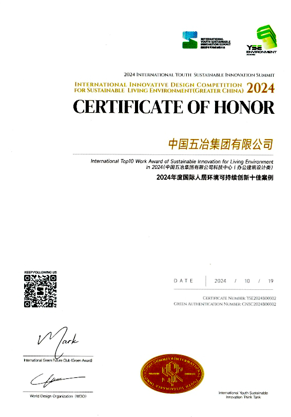 10月19日-20日,由中國科學技術協會指導,中國國土經濟學會主辦的2024國際青年可持續(xù)創(chuàng)新大會(YSS 2024)召開。會議現場,組委會聯合世界設計組織(WDO)、綠色未來俱樂部(德國綠獎)發(fā)布了2024國際人居環(huán)境可持續(xù)創(chuàng)新設計大賽(YSE Award)評比結果,中國五冶集團提交的五冶科技中心設計項目從全球1600余件參賽作品中脫穎而出,獲評國際人居環(huán)境可持續(xù)創(chuàng)新十佳案例,中國五冶集團獲評綠色可持續(xù)設計機構。
