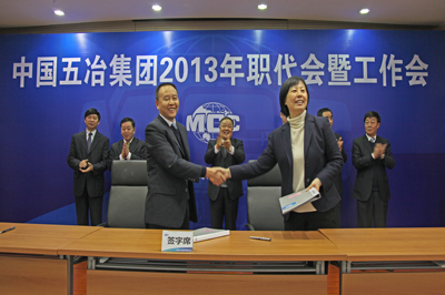 會(huì)議期間,集團(tuán)公司職工首席代表、工會(huì)主席周悅靜與集團(tuán)公司首席代表、董事、總經(jīng)理蒙昌嘉簽訂了《中國(guó)五冶集團(tuán)2013年度職工工資集體協(xié)議》,公司董事長(zhǎng)、黨委書(shū)記程并強(qiáng)與公司董事、總經(jīng)理蒙昌嘉簽訂了《經(jīng)營(yíng)承包責(zé)任書(shū)》,公司董事、總經(jīng)理蒙昌嘉與副總工程師唐世榮簽訂《新技術(shù)產(chǎn)品經(jīng)營(yíng)管理責(zé)任書(shū)》、與四川地區(qū)各分子公司經(jīng)理簽訂了《經(jīng)營(yíng)承包責(zé)任書(shū)》。