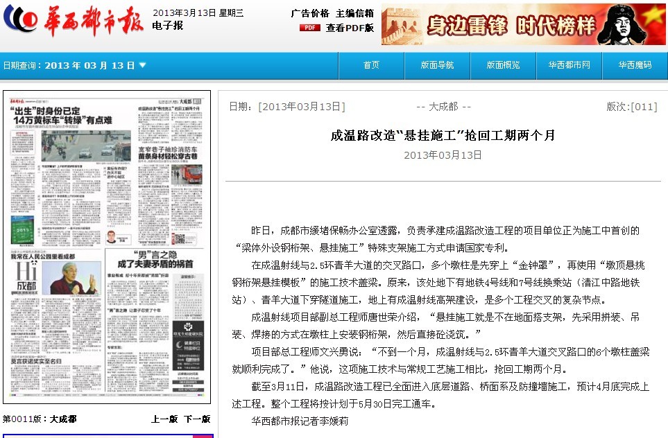 昨日,成都市緩堵保暢辦公室透露,負(fù)責(zé)承建成溫路改造工程的項(xiàng)目單位正為施工中首創(chuàng)的“梁體外設(shè)鋼桁架、懸掛施工”特殊支架施工方式申請(qǐng)國(guó)家專利。