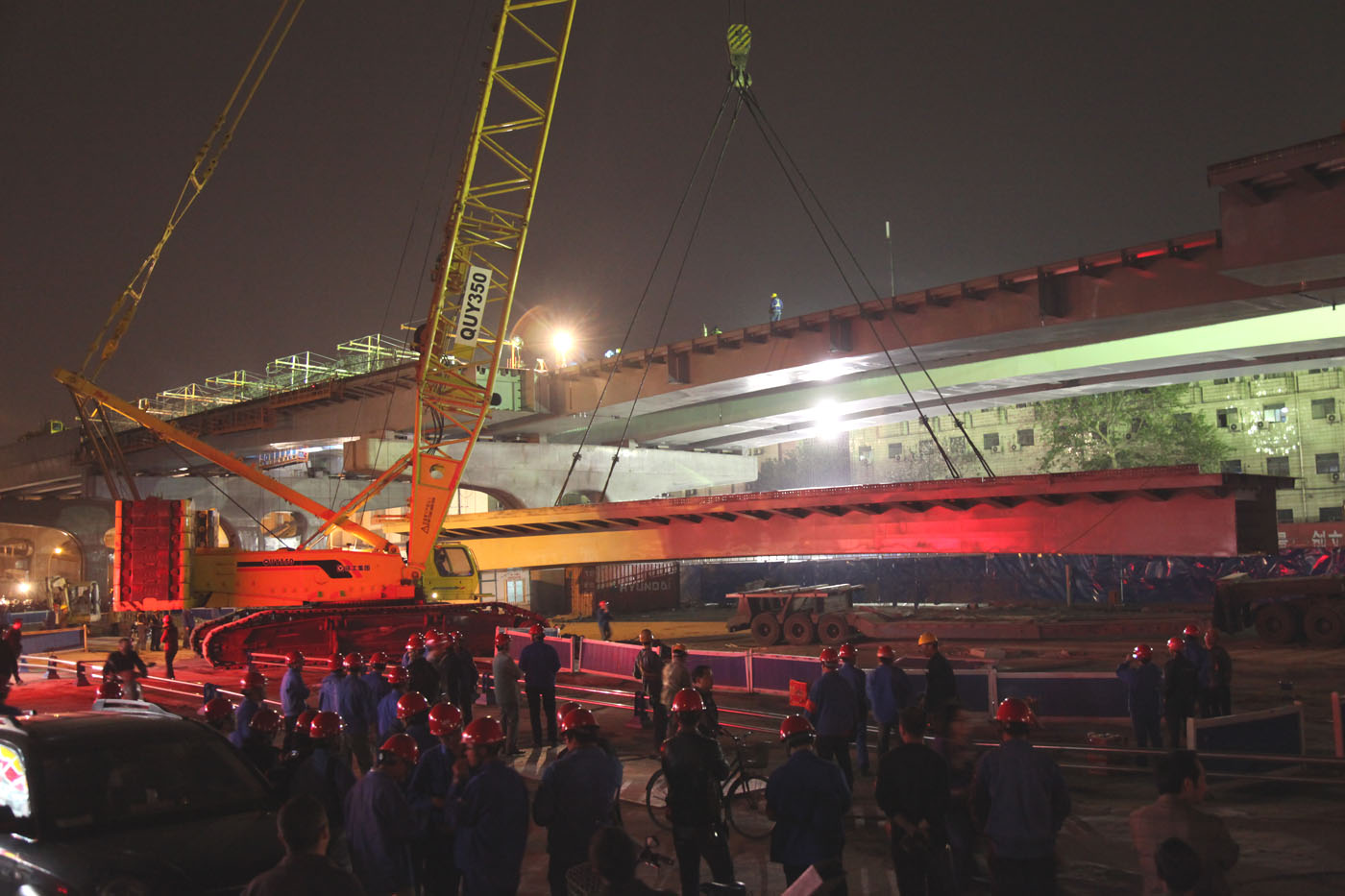成溫路改造工程東起于二環(huán)路成溫立交橋,西止于三環(huán)路蘇坡立交橋東側(cè),全長2.5公里。建成后的成溫路車速將由現(xiàn)有的20公里/小時提高到60公里/小時,實現(xiàn)城西方向的快速出城,其中的快速公交系統(tǒng)將與地鐵四號、七號線無縫對接,形成城西立體交通網(wǎng)。項目自2012年11月23日首吊小箱梁以來,經(jīng)過項目部全體員工123天全力以赴地辛勤勞動,順利完成了全部650片小箱梁及16000㎡鋼箱梁的吊裝,提前5天實現(xiàn)業(yè)主要求的節(jié)點目標。