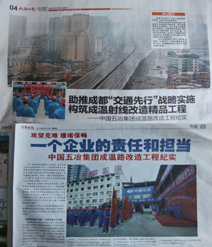 《成都日?qǐng)?bào)》以《助推成都‘交通先行’戰(zhàn)略實(shí)施?構(gòu)筑成文射線改造精品工程》為題,從抽調(diào)精兵強(qiáng)將攻堅(jiān)五大難題、創(chuàng)新工藝技術(shù)實(shí)現(xiàn)三項(xiàng)之最、團(tuán)隊(duì)攻堅(jiān)克難彰央企風(fēng)采等三個(gè)方面對(duì)成溫路改造工程進(jìn)行了全面報(bào)道,文中寫到:“提前25天,整個(gè)成溫路改造工程具備通車條件,搶回了近五個(gè)月的工期,打贏了這場(chǎng)緩堵保暢的‘戰(zhàn)役’。”?《成都晚報(bào)》則以《一個(gè)企業(yè)的責(zé)任和擔(dān)當(dāng)》為題,報(bào)道了中國(guó)五冶集團(tuán)在成溫路項(xiàng)目實(shí)施過(guò)程中首次采用“鋼桁架無(wú)支架施工”技術(shù),開創(chuàng)了同類橋梁施工的先河。同時(shí)點(diǎn)名報(bào)道了文興勇、李代光等一批優(yōu)秀項(xiàng)目骨干,盛贊由他們組成的團(tuán)隊(duì)“一次次攻堅(jiān)克難,為順利完成各個(gè)節(jié)點(diǎn)作出了貢獻(xiàn)”。(張旖)