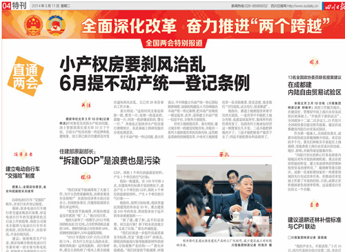 3月11日《四川日報》頭版、04版和12日《四川日報》05版兩會特刊,刊發(fā)了全國人大代表、中國五冶集團董事長、黨委書記程并強接受采訪的新聞。
