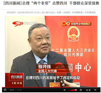 為此,四川衛(wèi)視在3月10日《四川新聞》“全國兩會特別報道”中,以“總理‘兩個非常’點贊四川?干部群眾深受鼓舞”為主題,對參加十二屆全國人大三次會議四川代表團(tuán)部分全國人大代表進(jìn)行了采訪,全國人大代表,中國五冶集團(tuán)董事長、黨委書記程并強(qiáng)在采訪中表示:總理對四川的發(fā)展給予了肯定和鼓勵,同時也指明了一些方向,特別是通過加大基礎(chǔ)設(shè)施建設(shè)、水利建設(shè)、交通建設(shè),促進(jìn)四川發(fā)展,要求四川轉(zhuǎn)型升級方面感觸很深?!?br/> http://news.cntv.cn/2015/03/10/VIDE1425997439608963.shtml央視網(wǎng)