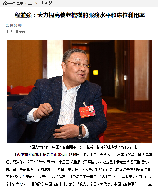 《香港商報網(wǎng)》記者以“大力提高養(yǎng)老機(jī)構(gòu)的服務(wù)水平和床位利用率”為題,從李克強(qiáng)總理的工作報告中“十三五”規(guī)劃綱要草案里有關(guān)“建立基本養(yǎng)老金合理調(diào)整機(jī)制;實現(xiàn)職工基礎(chǔ)養(yǎng)老金全國統(tǒng)籌等,完善職工養(yǎng)老保險個人賬戶制度;建立以居家為基礎(chǔ)的多層次養(yǎng)老服務(wù)體系等”出發(fā),就如何提高養(yǎng)老機(jī)構(gòu)服務(wù)水平,如何提高養(yǎng)老床位利用率等話題,對全國人大代表,中國五冶集團(tuán)董事長、黨委書記程并強(qiáng)進(jìn)行了專訪。