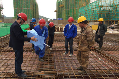 貴陽貴安新區(qū)大壩項目管理人員正在現(xiàn)場進(jìn)行地下車庫頂板鋼筋驗收