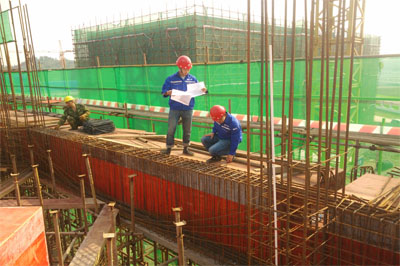 南充鑫達(dá)項目技術(shù)員在對鋼筋綁扎、梁柱截面尺寸進(jìn)行例行檢查