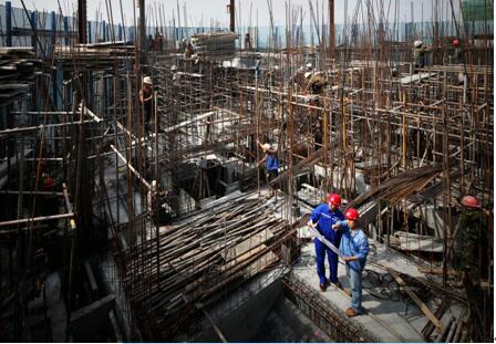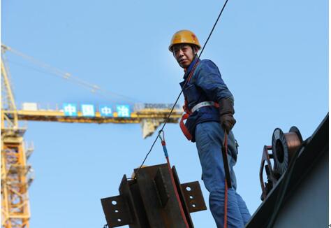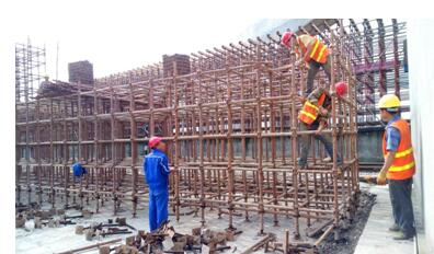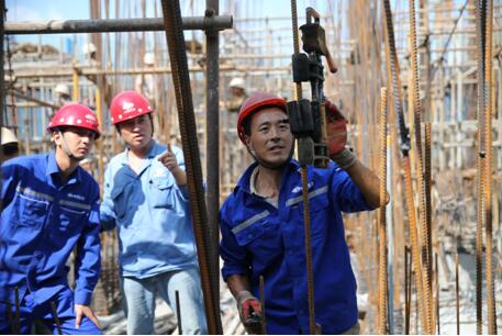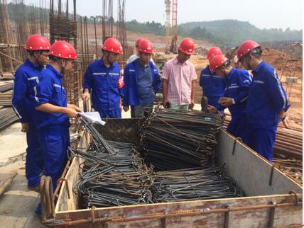 新華之星B區(qū)核心筒正在現(xiàn)場檢查鋼筋焊接的工作人員