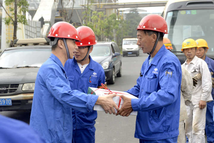 ????金秋十月,丹桂飄香,在舉國上下祝福祖國母親67歲華誕,人們沉浸在熱鬧祥和的節(jié)日氣氛中時,公司廣大工程建設者為了項目建設依然奔波在施工一線。10月1日,中國五冶集團董事長、黨委書記程并強、董事、總經(jīng)理朱永繁、黨委副書記、副總經(jīng)理劉偉、副總經(jīng)理萬明海、副總經(jīng)理譚興山及工會一行,來到成都招商中央華城和藍光雍錦閣項目現(xiàn)場,慰問奮戰(zhàn)在施工一線的廣大員工們,向他們送去豬肉、水果等節(jié)日慰問品,并與一線員工們傾心交流,為大家送上關懷和祝福。