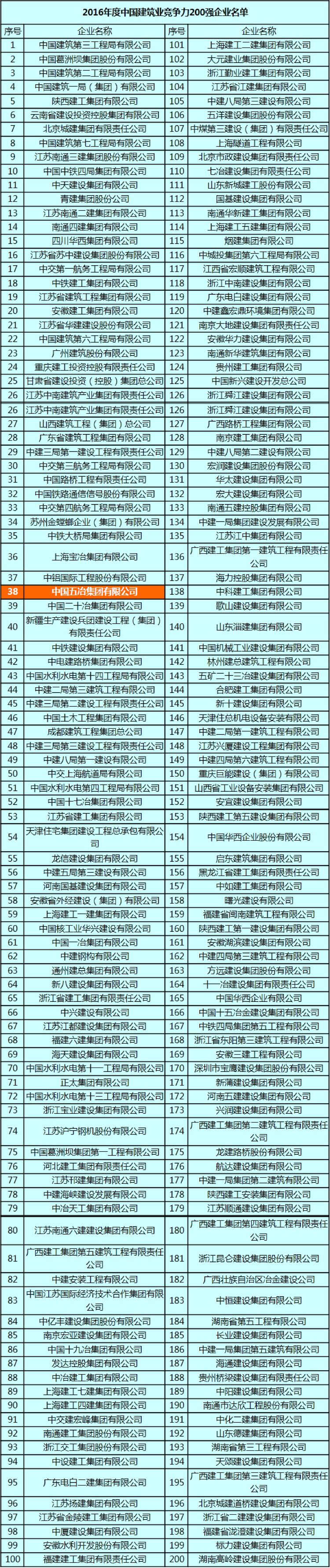 附:2016年度中國建筑業(yè)競爭力200強(qiáng)企業(yè)名單