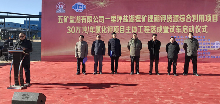 當(dāng)日,由中國(guó)五冶集團(tuán)有限公司承建的五礦鹽湖有限公司一里坪鹽湖鋰礦鋰硼鉀資源綜合利用項(xiàng)目(以下簡(jiǎn)稱“一里坪鹽湖項(xiàng)目”)30萬噸/年氯化鉀項(xiàng)目主體工程落成暨試車啟動(dòng)儀式在此舉行,標(biāo)志著一里坪鹽湖項(xiàng)目取得了重大階段性勝利。五礦鹽湖有限公司總經(jīng)理李增榮,副總經(jīng)理張大義、支雪斌,中國(guó)五冶集團(tuán)副總經(jīng)理程先云,以及設(shè)計(jì)、監(jiān)理單位相關(guān)負(fù)責(zé)人,中國(guó)五冶集團(tuán)成都機(jī)電公司相關(guān)人員等出席儀式,儀式由五礦鹽湖有限公司副總經(jīng)理侯昭飛主持。