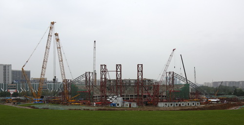 在主舞臺的施工現(xiàn)場,兩臺大吊車吊起一根鋼筋龍骨,在空中緩慢移動,而在地面的基座上,幾名焊工正在緊張焊接粗壯的支撐架?!斑@是我們吊裝的第二根主拱構(gòu)件,第一根已經(jīng)在昨天成功吊裝并脫鉤?!背啥悸短煲魳饭珗@項(xiàng)目經(jīng)理呂興建告訴記者團(tuán),近段時(shí)間,主拱的吊裝都將是最重要的任務(wù)。