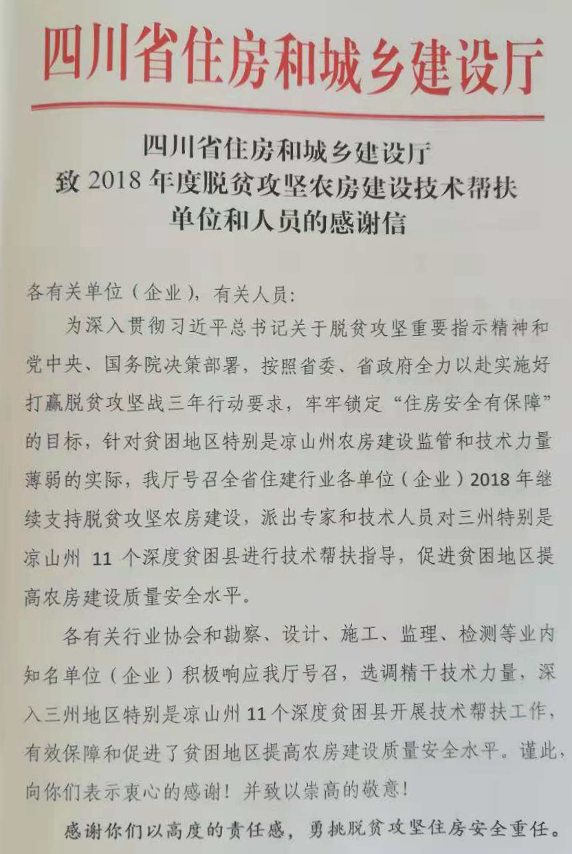 《感謝信》表示,感謝你們以高度的責(zé)任感,勇挑脫貧攻堅住房安全重任。在2016年、2017年對涼山州脫貧攻堅農(nóng)房建設(shè)技術(shù)幫扶支持的基礎(chǔ)上,再次組織和選調(diào)技術(shù)骨干,組成技術(shù)幫扶組駐守深度貧困縣,展現(xiàn)了住建行業(yè)模范企業(yè)的擔(dān)當(dāng)和風(fēng)采,發(fā)揮了行業(yè)榜樣的作用。感謝你們竭盡全力攻堅克難,與廣大貧困群眾同心同行確保安全。你們派駐的專家和專業(yè)技術(shù)人員走村寨、訪農(nóng)戶,深入脫貧攻堅農(nóng)房建設(shè)現(xiàn)場,吃苦耐勞、盡職盡責(zé),有效幫助地方完善農(nóng)房質(zhì)量安全監(jiān)管體系,培訓(xùn)指導(dǎo)建房工匠,及時發(fā)現(xiàn)質(zhì)量安全問題并指導(dǎo)各方責(zé)任主體落實整改,為保障三州脫貧攻堅農(nóng)房建設(shè)質(zhì)量安全做出了貢獻。